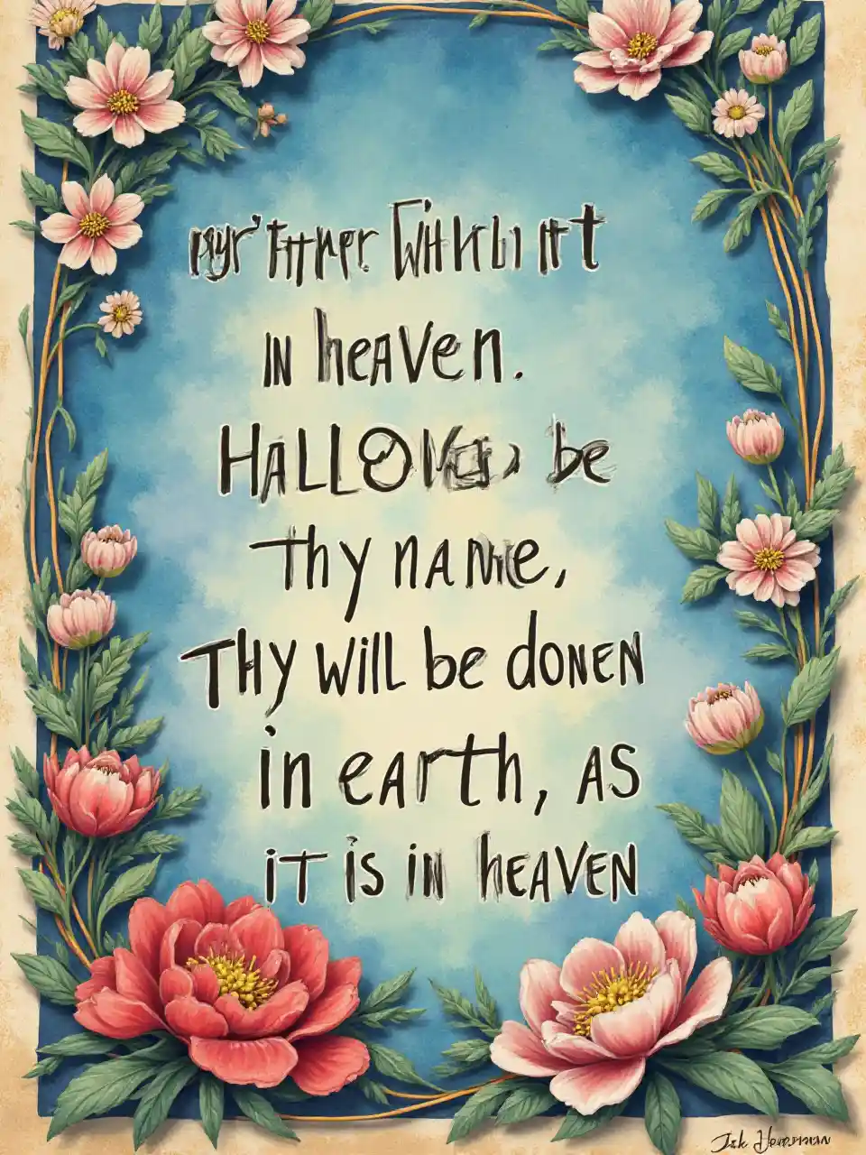 আমাদের পিতা যিনি স্বর্গে আছেন, আপনার নাম পবিত্র করা হবে. তোমার রাজ্য আসুক। তোমার ইচ্ছা যেমন স্বর্গে তেমনি পৃথিবীতেও পূর্ণ হোক। শিল্পীগত ছাপ