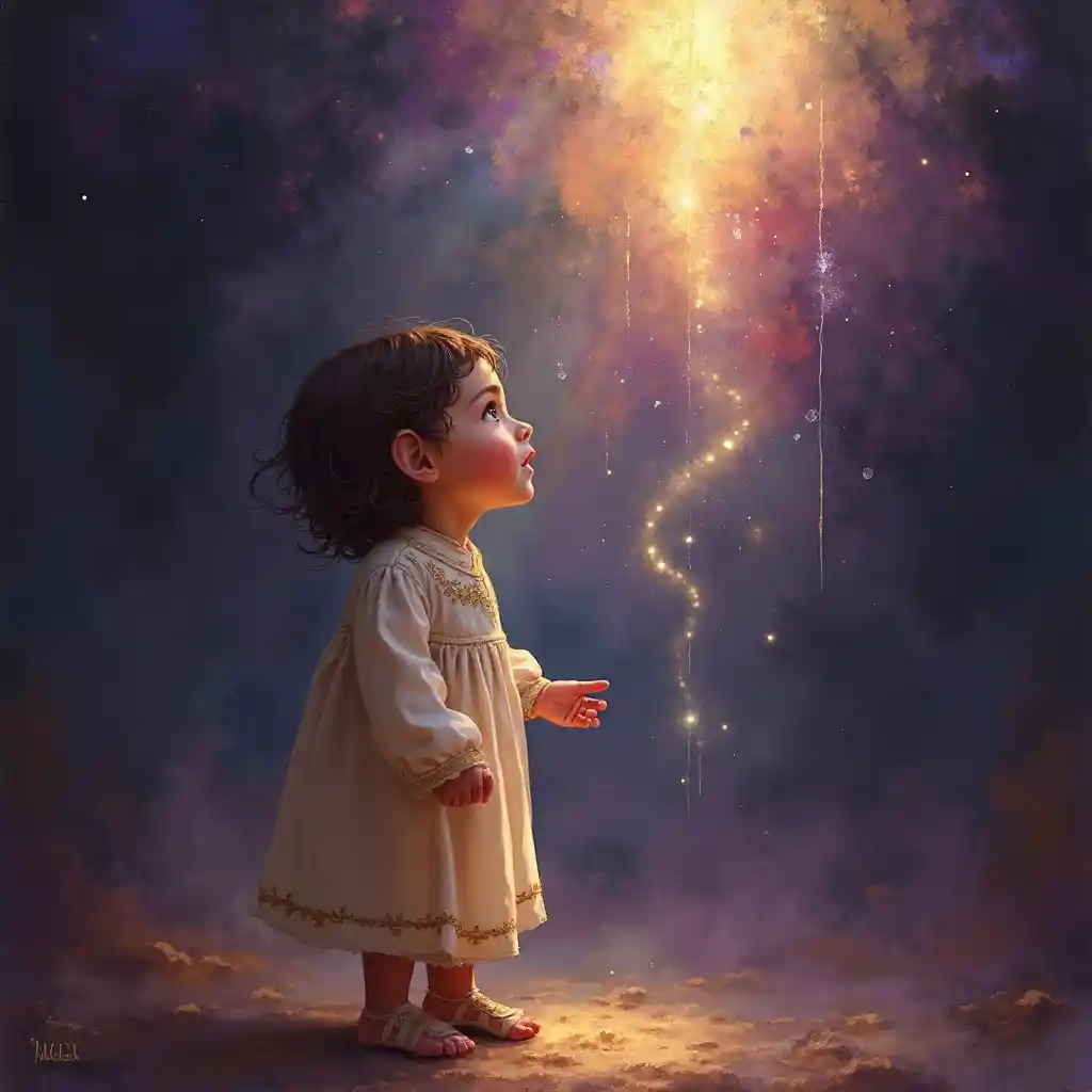 ফ্যান্টাসি আর্ট, চিত্রকলা, জলরঙ এবং তেল মিশ্রণ, অতি বিস্তারিত ৩২ কে মাস্টারপিস, সিনেমার বিপরীতে, একটি ছোট শিশু নরম অন্ধকারে দাঁড়িয়ে, মৃদু যাদুকর আন্ডারলাইটের মধ্যে স্নান করে - বেগুনি, স্বর্ণ এবং গোলাপের রং তাদের নির্দোষ মুখ জুড়ে উজ্জ্বলতা ছড়িয়ে দেয়, একটি সাধারণ সাদা পোশাক পরা সহজ উজ্জ্বল সূচিকর্ম, বিস্ময়ের সাথে প্রশস্ত, একটি ছোট হাত উপরে পৌঁছায়, উপরে থেকে lightশ্বরের উষ্ণতা মত পড়ে, পটভূমিটি ধনী ছায় w/নরম লাল & স্বর্গীয় স্বর, ইথের এবং শ্রদ্ধাশীল মেজাজ, সূক্ষ ব্রাশ টেক্সচার, একটি সন্তানের স্বর্গীয় পিতার দিকে পৌঁছানোর প্রতীক, আশা এবং ভালবাসা পূর্ণ