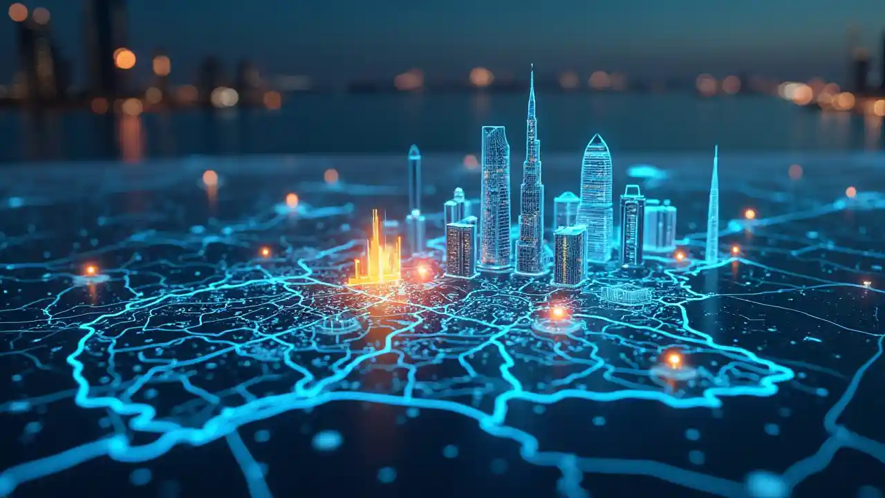 দুবাইয়ের প্রাণবন্ত গুরুত্বপূর্ণ জেলাগুলির সাথে অতি বাস্তব 8K হলোগ্রাফিক মানচিত্র