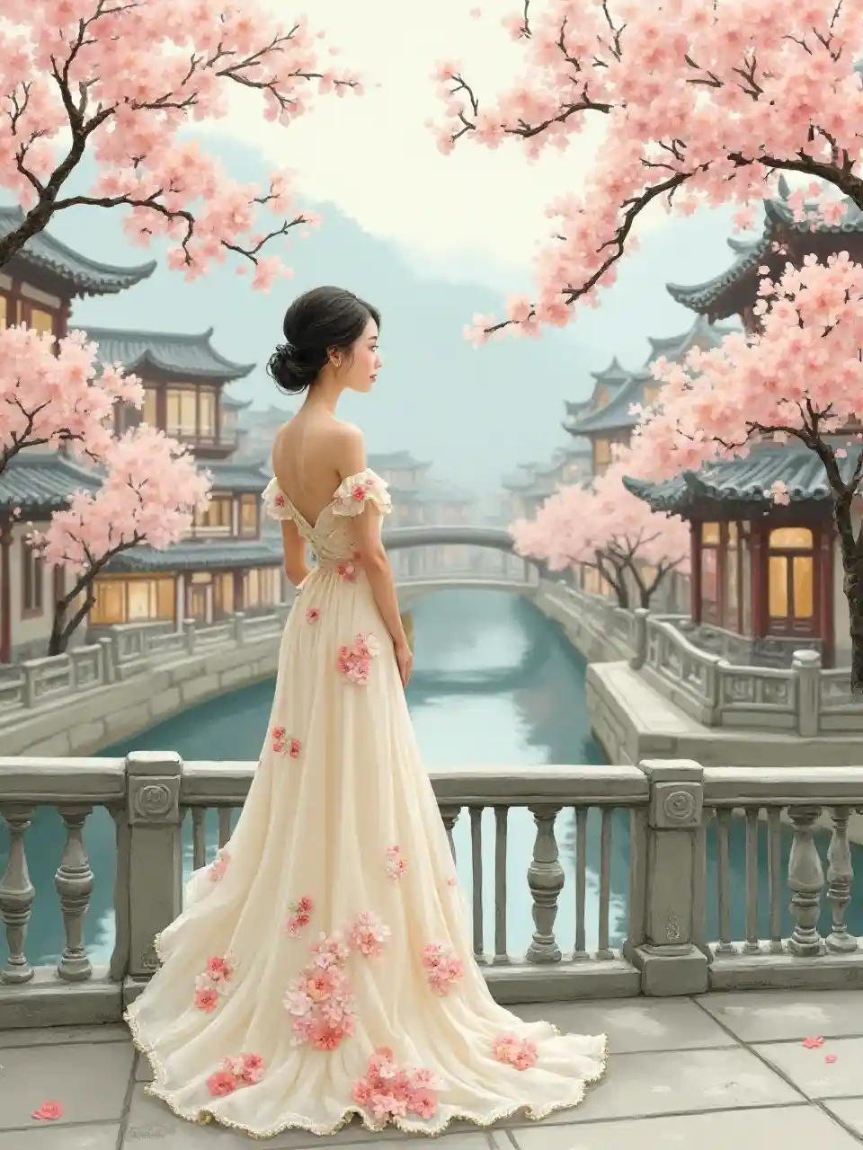 হালকা ফুলের পোশাক পরে থাকা মহিলা এশিয়ান-ইউরোপীয় স্থাপত্যের মিশ্রণ সহ চিত্রিত শহরের জলপথের দিকে তাকিয়ে আছেন। চেরি ফুল। নরম পাস্টেল প্যালেটঃ বেজ, ধূসর, হালকা নীল, গোলাপী। সূক্ষ্ম ব্রাশওয়ার্ক, বায়ুমণ্ডল/আলোর উপর ফোকাস. রোমান্টিকতা/ফ্যান্টাসির চিত্র তুলে। সৌন্দর্য, শান্ত।