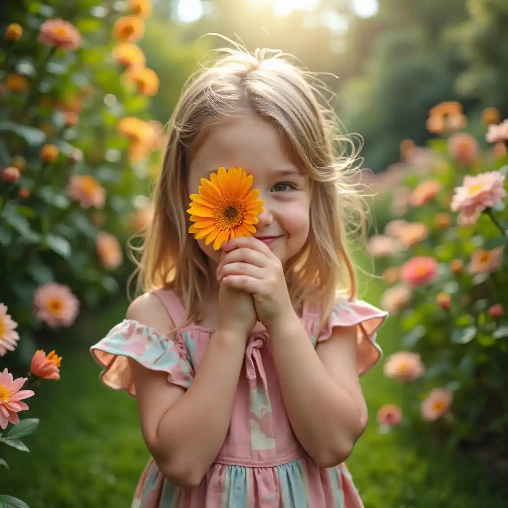 একটি কৌতুকপূর্ণ বাগানে, একটি তরুণী তার ঠোঁটের একপাশে হাসিখুশি হাসি দিয়ে দাঁড়িয়ে আছে। তার মুখের একটি অংশ রঙিন ফুল দিয়ে সূক্ষ্মভাবে ঢেকে রাখে, এর পাতা তার ত্বকের সাথে প্রাণবন্ত এবং উজ্জ্বল। সূর্যের আলো পাতার মধ্য দিয়ে ছড়িয়ে পড়ে, তার চেহারাতে উষ্ণতা ছড়িয়ে পড়ে, যা দুষ্টু এবং কবলে ভরা। তার পেছনে, সবুজতা এবং ফুলের ফুল একটি জাদুকরী পটভূমি তৈরি করে, দৃশ্যের যাদু যোগ করে
