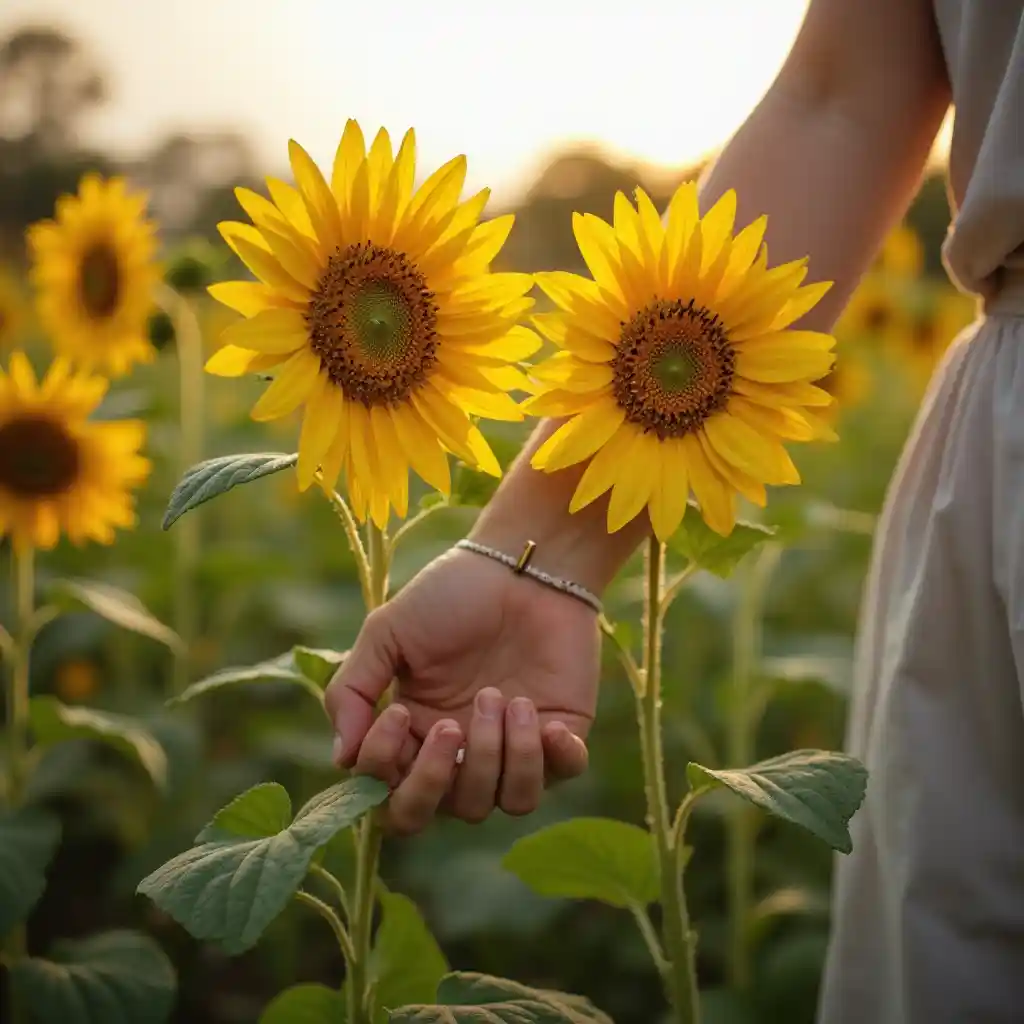 দুইটি সূর্যমুখী ফুলের পাতায় হাত রেখেছে। এটা অবশ্যই একটি ক্ষেত্রের পটভূমিতে একটি মৃদু ছবি হতে হবে,