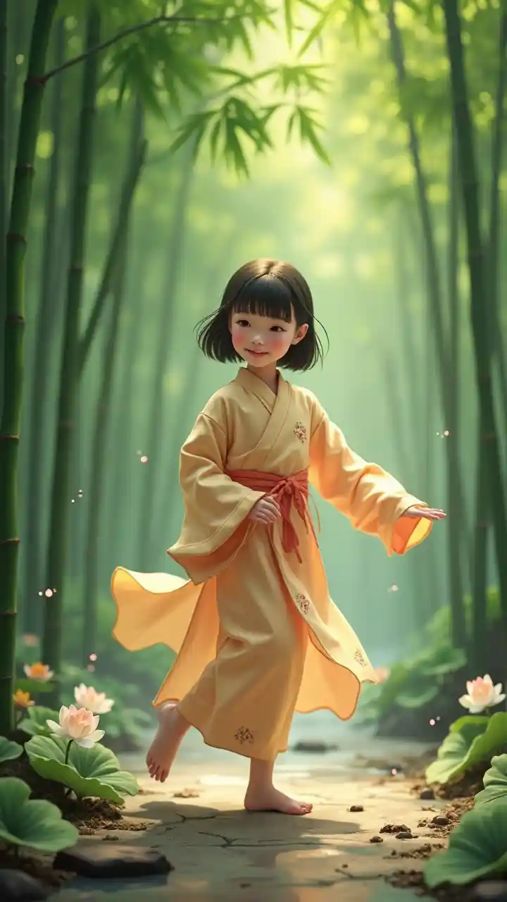 একটি বব চুল কাটা 7 বছর বয়সী এশিয়ান মেয়ে একটি বাঁশের গাছের মধ্যে নাচছে, লোটাস সূচক সঙ্গে একটি রেশম জামা পরে। তার চারপাশে লাইটফ্লাই এবং কুয়াশাচ্ছন্ন পুকুর রয়েছে। তার মার্জিত ঘূর্ণন প্রকৃতির অনুপ্রাণিত একটি শান্ত পরিবেশে শান্ত এবং কৌতুকপূর্ণ আকর্ষণের বহিঃপ্রকাশ করে।
