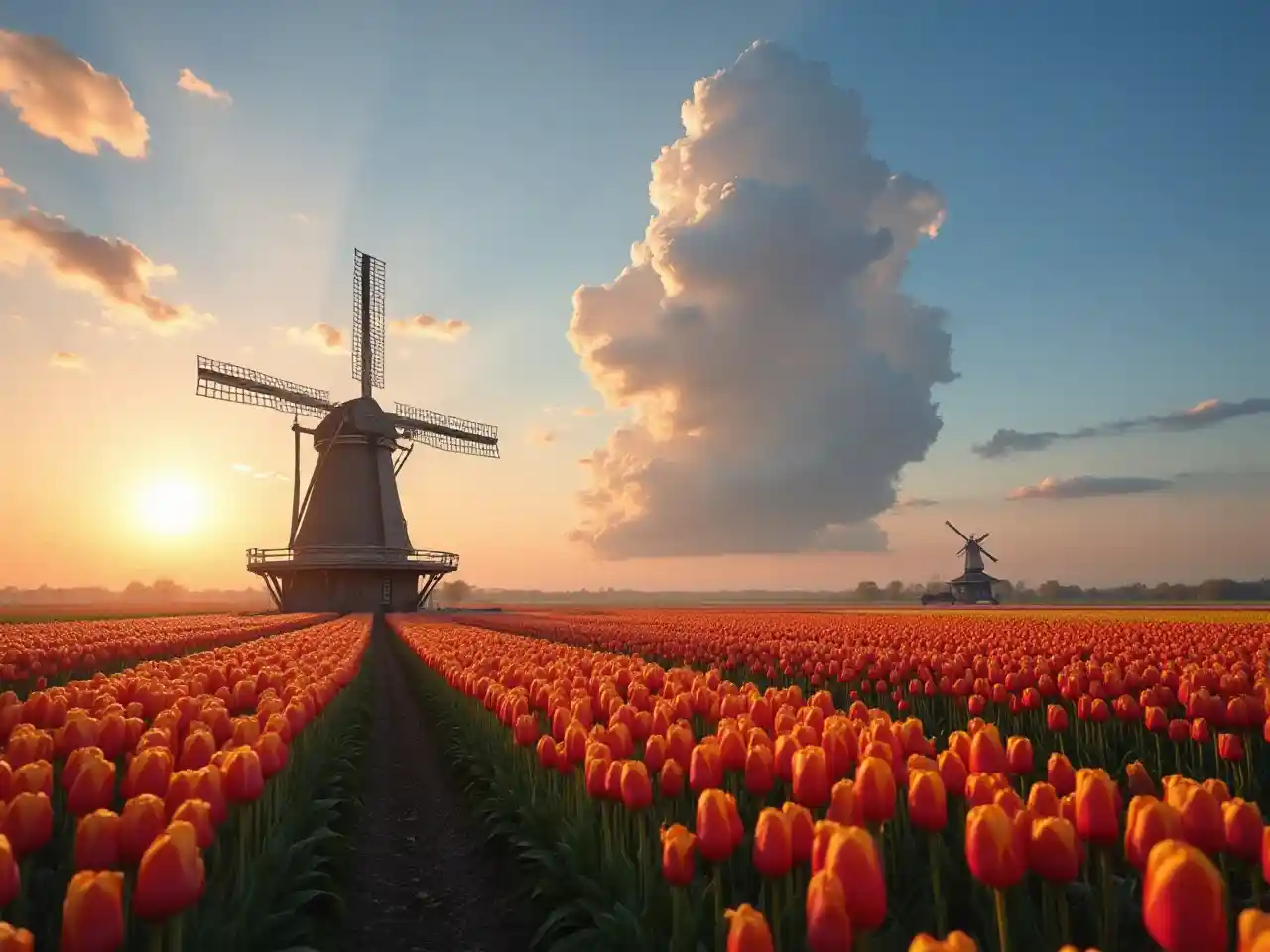 সূর্যোদয়ের সময় ডাচ গ্রামের বায়ু মিন এবং টিউলিপ