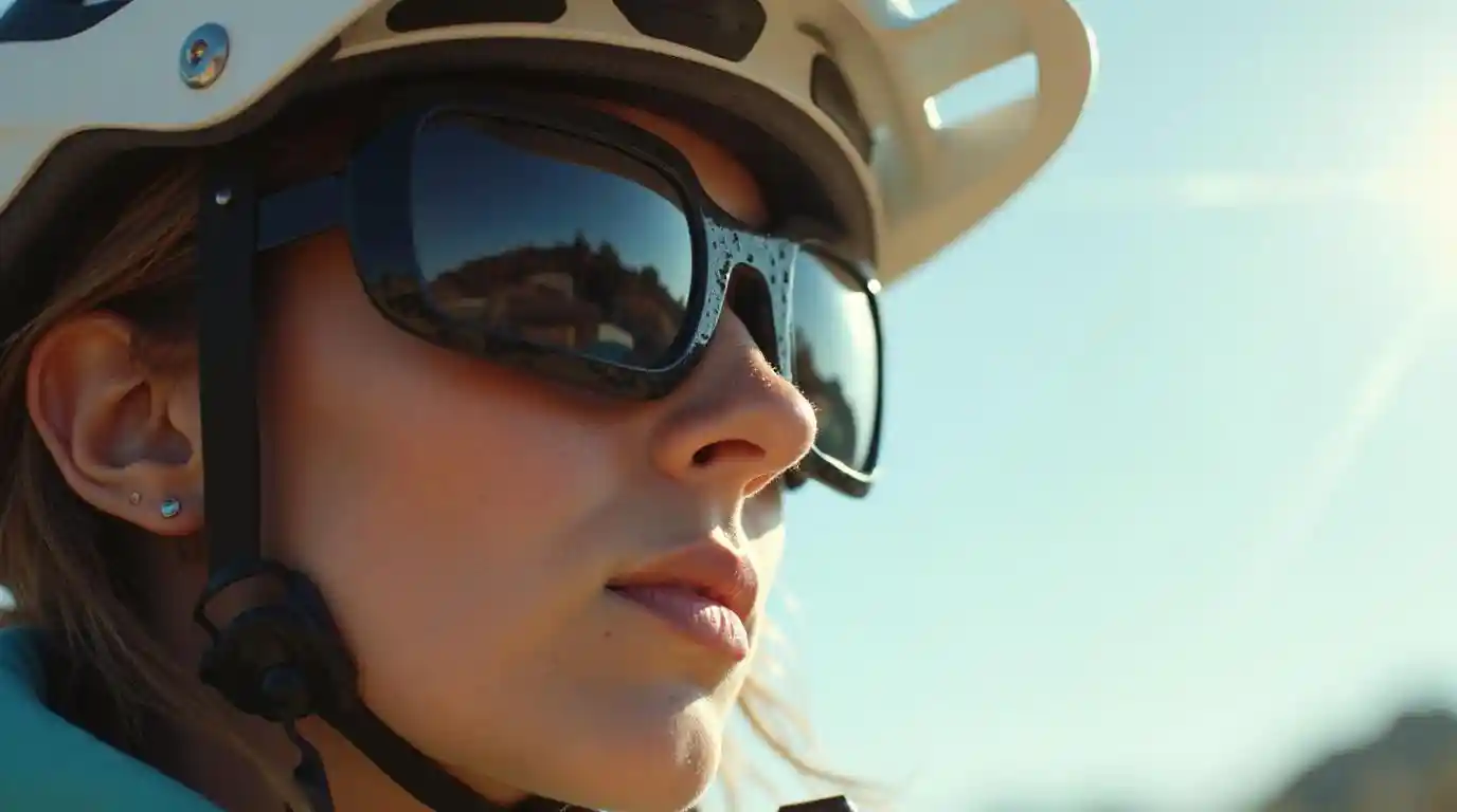 আকাশকে প্রতিফলিত করে সাদা হেলমেট এবং কালো সানগ্লাস পরা একজন ইতালীয় মহিলার চরম ক্লোজ। সিনেমাটিক শট, প্রাকৃতিক আলো, অ্যান্ডো ফাদাথান্ডারের স্টাইলে। হাইপার-রিয়েলিস্টিক, গ্লাসের উপর পানি। সূর্যের আলো, সূর্যের রশ্মি।