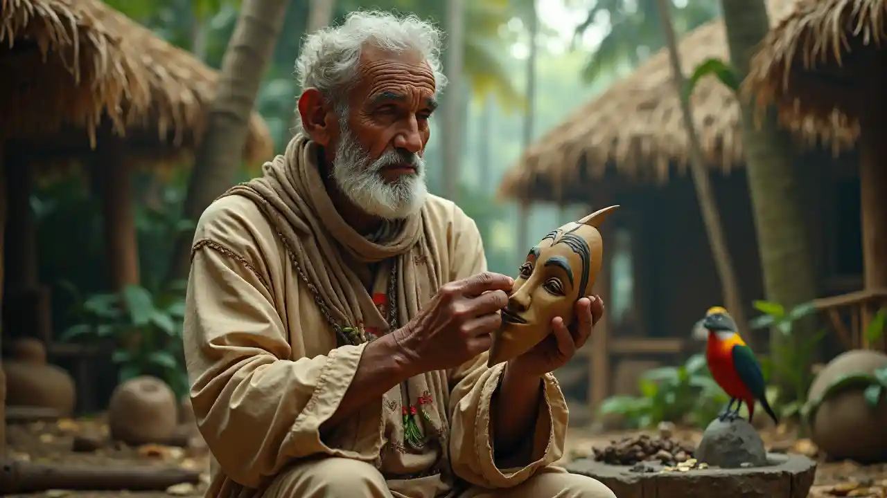জঙ্গলের একটি গ্রামে মাস্ক খোদাই করে, ৭৬ বছর বয়সী মধ্যপ্রাচ্যের একজন স্কার্ফযুক্ত একজন ব্যক্তি দ্রাক্ষারস সূচিকর্মের সাথে একটি টুনি পরছেন। তাঁতযুক্ত কুটির এবং বহিরাগত পাখি তাকে ফ্রেম করে, তার যত্নবান চামচগুলি একটি উর্বর, কল্পিত পরিবেশে সৃজনশীলতা এবং সাংস্কৃতিক অহংকারকে প্রকাশ করে। তার চোখ গল্প দিয়ে ঝলকায়।