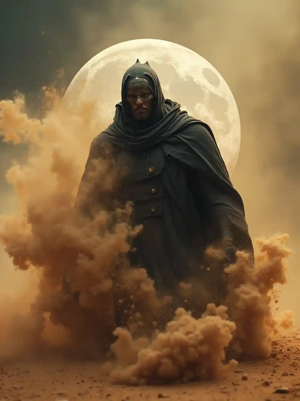 চাঁদ রথী ঘূর্ণমান বালিতে দ্রবীভূত হচ্ছে, ভলিউম্যাটিক ধুলো, সিনেমাটিক আলো, নিকটবর্তী চিত্র