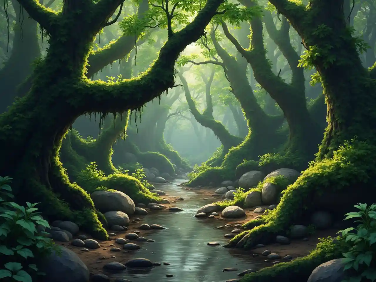 প্রাচীন বন Mossy → জুম আউট, একটি ছোট খাল এবং আরো পাথর যোগ
