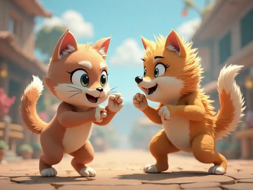 3D চরিত্র কুকুরের গ্রহ এবং বিড়ালের গ্রহের মধ্যে একটি তীব্র সুন্দরতা যুদ্ধ, রাস্তার যোদ্ধা শৈলী, ঘূর্ণী মহিলা বিড়াল এবং ঘূর্ণী মহিলা কুকুর তাদের c