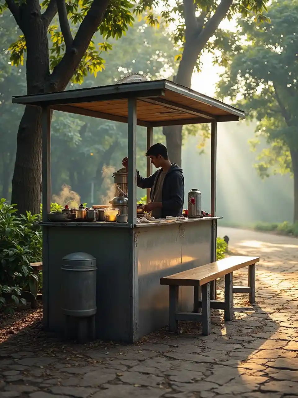 ভারতের একটি পার্কের বাইরে একটি পরিষ্কার রাস্তার পাশে চা স্টল, চা স্টলের দেয়ালের উপর ইস্পাত ফিনিস, একজন ব্যক্তি স্টলের ভিতরে চা তৈরি করছেন, কিছু বাষ্প থেকে আসছে এবং স্টলের ভিতরে, দুইটি দীর্ঘ বেঞ্চ গ্রাহকদের বসতে একটু দূরে, সূর্যের আলো আকাশ থেকে প্রবাহিত