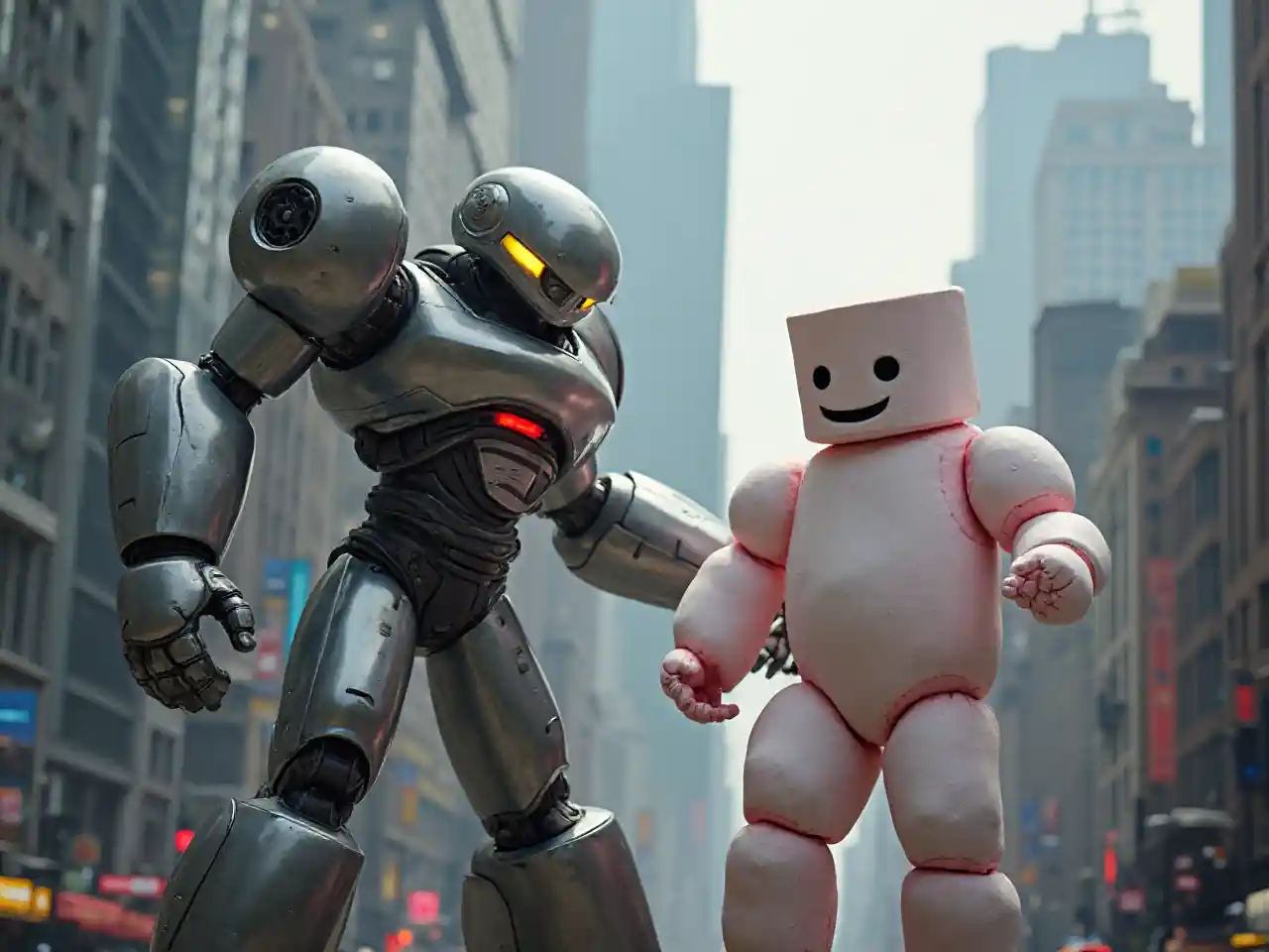 নিউ ইয়র্কে একটি বিশাল রোবট জেগার মেশমেলো ম্যানের সাথে লড়াই করছে