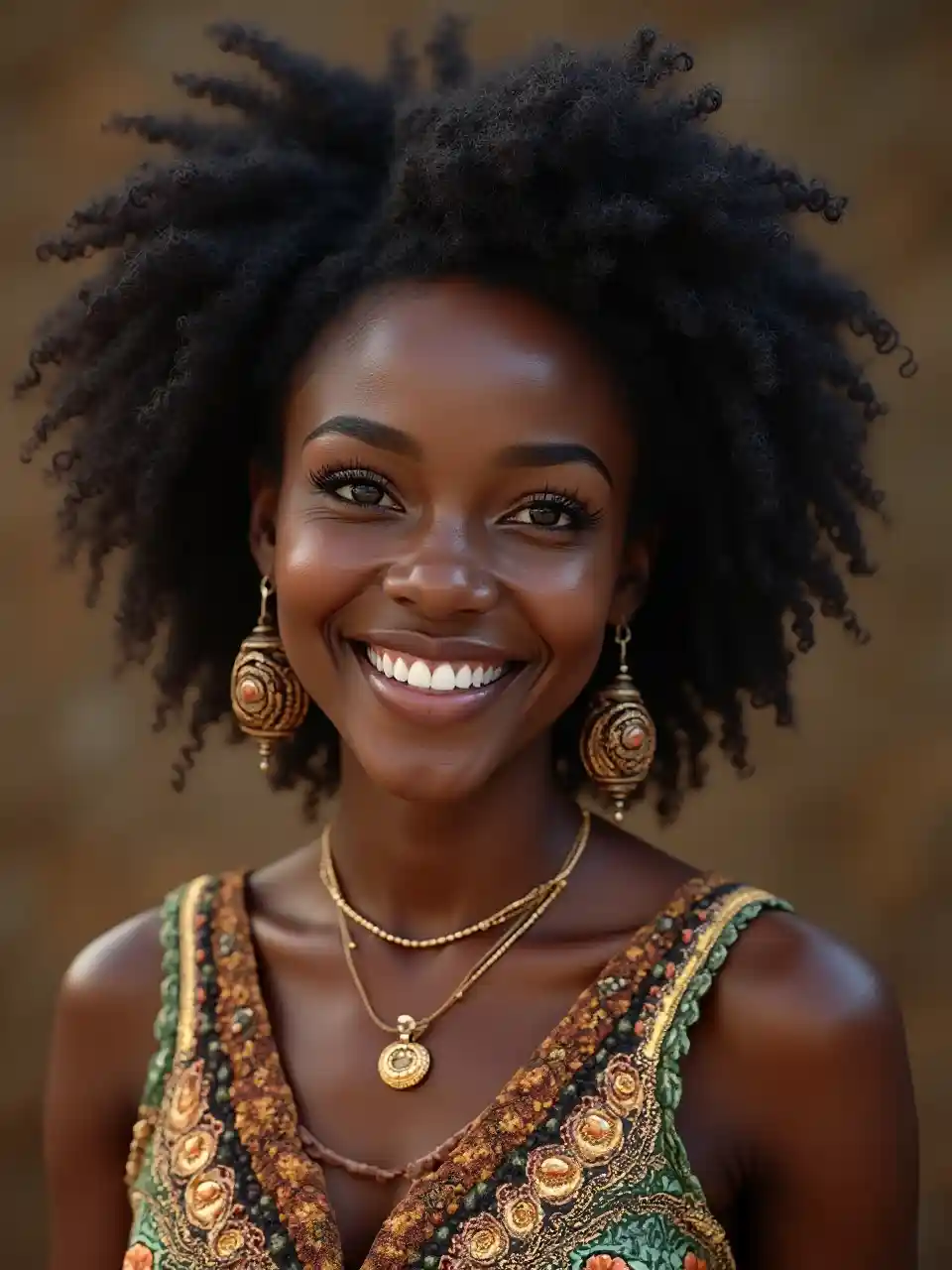 একজন ফটোগ্রাফিক দক্ষিণ আফ্রিকার ৩০ বছরের নারী, গাঢ় ত্বক, কোঁকড়ানো চুল, ঐতিহ্যবাহী আফ্রিকান পোশাক পরে, উষ্ণভাবে হাসে, উচ্চ বিবরণ, 8K রেজোলিউশন