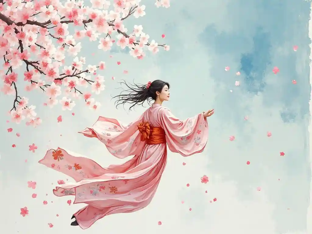 Aidenমাটিয়ার, শুকনো ব্রাশ, ইম্যাস্টো, দীর্ঘ-কোঁকড়ানো কিমোনো পরা একজন মহিলা আকাশে উড়ে যায় এবং চেরি ফুল ছড়িয়ে দেয়, কমনীয়তা, উষ্ণতা, বাতাস, বসন্ত