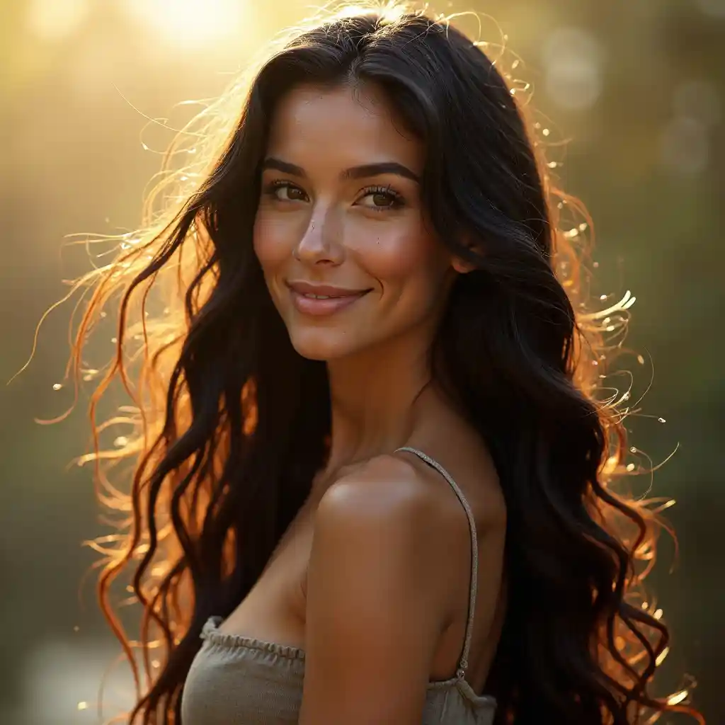 একটি (অত্যন্ত বিস্তারিত এবং পুরো শরীরের অতি বাস্তববাদী ছবি) যেখানে একটি খুব সুন্দর এবং যুবতী নারীকে ধরা হয়েছে, যার লম্বা, লোভনীয় কালো চুল তার পিঠে মসৃণভাবে প্রবাহিত হয়, একটি ফিট, প্রবাহিত স্কার্ট যা তার প্রাকৃতিক সৌন্দর্যকে বাড়ায়। তার হাসি উষ্ণ এবং আমন্ত্রণমূলক, পরিবেশের নরম আলো প্রতিফলিত। তার মুখের উপর কয়েকটা আলো ঝরছে, যা তার চেহারাকে তুলেছে এবং প্রকৃতির যাদু যোগ করেছে।
