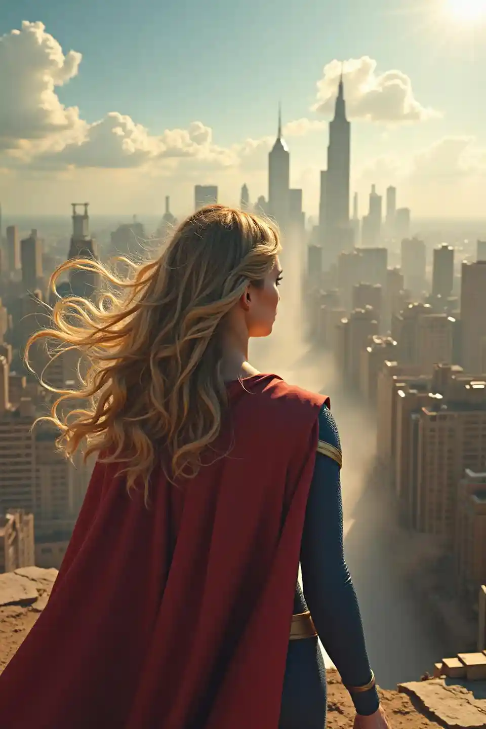 সুপারগার্ল উঁচু আকাশ থেকে একটি ভাল seasoned শহর তাকিয়ে, মাটি থেকে ঝাঁকুনি জাল এবং matted চুল দেখায় যে বায়ু খুব হিংস্রভাবে, ধুলো