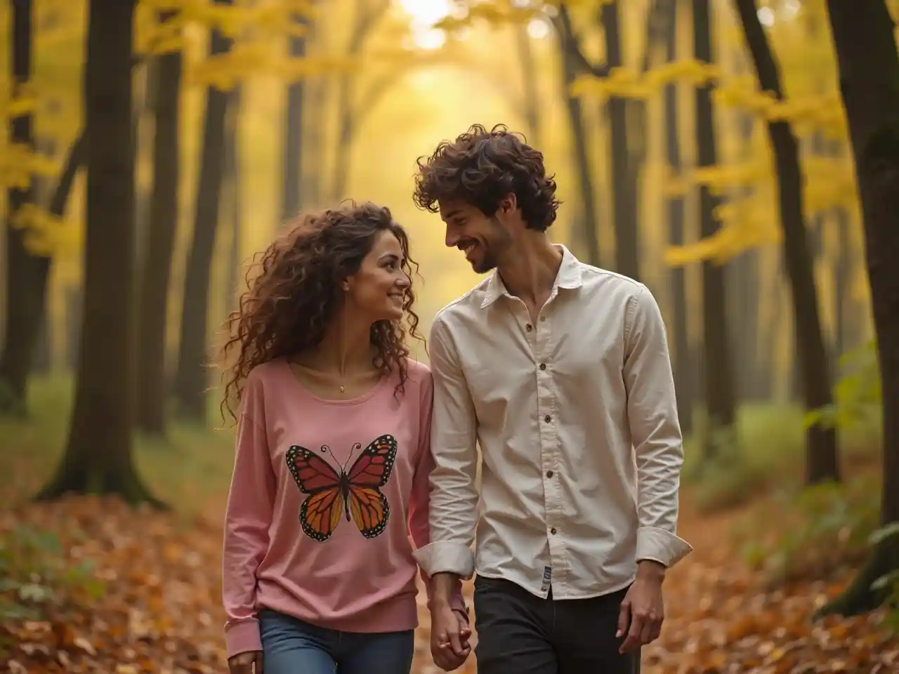 একটি লম্বা পুরুষ এবং তার বান্ধবী এর শরৎ বনের হাঁটা