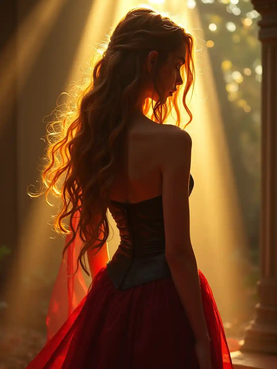 একটি (((সূর্যালোক এবং আলোকিত পটভূমি))), নরমভাবে একটি (((তাপ, সোনার আলোক))), যা ভ্যাম্পায়ারের শরীর থেকে নির্গত হয় এবং তার চিত্রের চারপাশে একটি আরামদায়ক, সুরক্ষামূলক আউরা ছড়িয়ে দেয়। তার লম্বা, প্রবাহিত চুল তার কোমর পর্যন্ত পড়ে, কল্পিতভাবে জটিল নিদর্শনগুলিতে বোনা, তার প্রাকৃতিক সৌন্দর্য এবং ভ্যাম্পায়ারের মার্জিত পোশাকটি তুলে ধরে ((ছায়া এবং আলোর মাস্টার মিশ্রণ))), একটি নাটকীয় প্যাবল তৈরি করে যা ভ্যাম্পায়ারের দীর্ঘ, প্রবাহিত লকগুলি এবং তার সূক্ষ্ম বিবরণগুলি (কর্সেট এবং সংক্ষিপ্ত, লাল স্কার্ট), যা অনন্ত পরিশীলন এবং প্রাকৃতিক মার্ক।