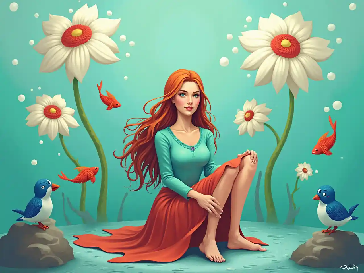 এটি একটি প্রাণবন্ত, কৌতুকপূর্ণ ডিজিটাল অঙ্কন যা একটি দীর্ঘ, প্রবাহিত লাল চুলের সাথে একটি অত্যাধুনিক পানির নিচে বসে আছে। তিনি তার পা ক্রস এবং তার হাঁটু উপর তার হাত দিয়ে রচনা কেন্দ্রস্থলে অবস্থিত। তার মাথায় একটা দীর্ঘ আঙ্গুলের তুর্কি শীর্ষ এবং একটি উজ্জ্বল লাল স্কার্ট আছে যা তার পায়ের আঙ্গুল পর্যন্ত পৌঁছেছে। তার চেহারা শান্ত এবং চিন্তাশীল, এবং তার শান্ত দৃষ্টি দর্শক উপর স্থির। তার চারপাশে বেশ কিছু রঙিন মাছ সাঁতার কাটছে। মাছগুলো মূলত লাল রঙের, নীল, হলুদ এবং সাদা অ্যাকসেন্ট দিয়ে, যা দৃশ্যটিকে একটি খেলার মত বিপরীত করে। তার মাথার উপর লাল কেন্দ্রের বড় বড় বিমূর্ত সাদা ফুল। এই ফুলগুলি জটিল বৃত্তাকার নিদর্শন এবং ঘূর্ণায়মান দিয়ে সজ্জিত। তার উপর আকাশ নীল ও সাদা রঙের, এবং তার চারপাশে ছোট সাদা বুদবুদ উড়ে। ছবির নীচের অংশে নীল এবং সাদা পালকযুক্ত বেশ কয়েকটি স্টাইলযুক্ত পাখি পাথরের উপর বসে বা জলে সাঁতার কাটছে। সামগ্রিকভাবে, শৈলীটি অত্যাধুনিকতা এবং কল্পনাকে মিশ্রিত করে, উজ্জ্বল রং এবং জটিল নিদর্শনগুলিতে জোর দেয়।