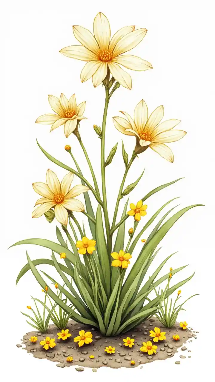 উদ্ভিদবিদ্যা চিত্র, গ্যাসমটানসাইট, হলুদ পাতার সাথে মাটি আবরণকারী উদ্ভিদ এবং ছোট সাদা ফুল, উচ্চ বিবরণ, কাটা, সাদা পটভূমি, মাস্টারপস, হাতে আঁকা, স্কেচ, 4k