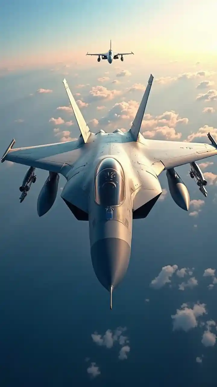 Et (((rafale)) jetfly med avanceret avionik, jager et (((f-16) jetfly)) som har slanke konturer og avanceret teknologi, der udsender et (((guldgl)) mod en baggrund af en (klar blå himmel), der illustrerer en følelse af (moden sofistikering) i 8 Ultra HD, avancerede visuelle, der skub grænserne for digital kunst