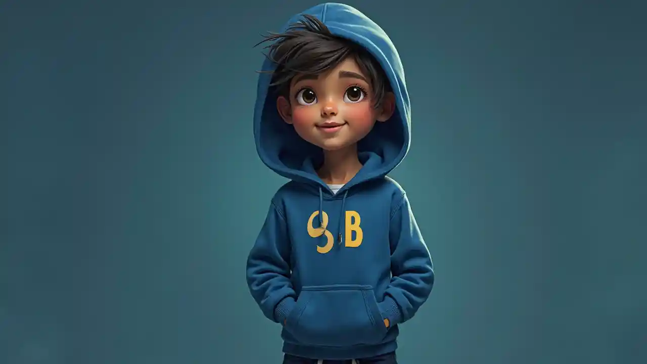 en afrikansk dreng med lysbrun hud og en blå hætte og en blå skjorte, der har bogstavet b på den og har mørke shorts