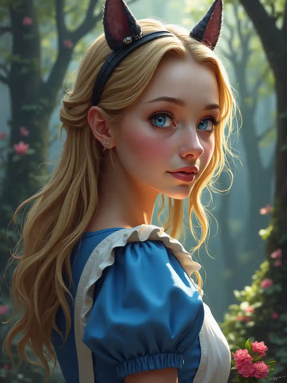 LeviPortræt af Alice i vidunderslandet, levende farver, vidvinkel, super detaljeret, professionel digital maleri, koncept kunst,