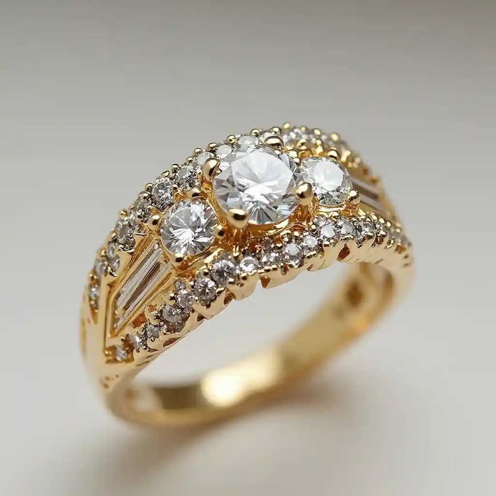 create a art deco diamond ring in yellow gold. one round diamond center with two round diamonds on each side of the center diamond. then channel set diamond baguettes around the outer part of the ring. add mill grain and filigree make the baguette diamonds halo the center diamond