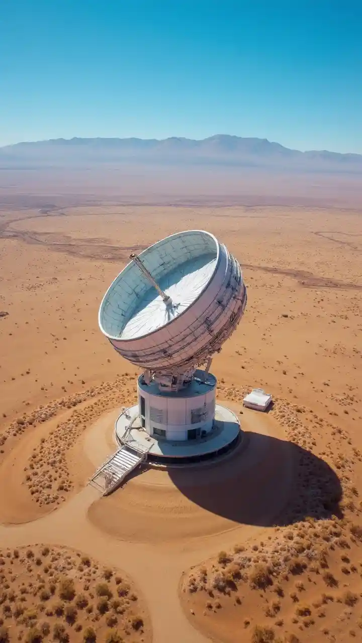 "Udsigt fra en drone af det eneste verdensberømte teleskop i Atacamaørkenen, mod det store sandlandskab med klar blå himmel".