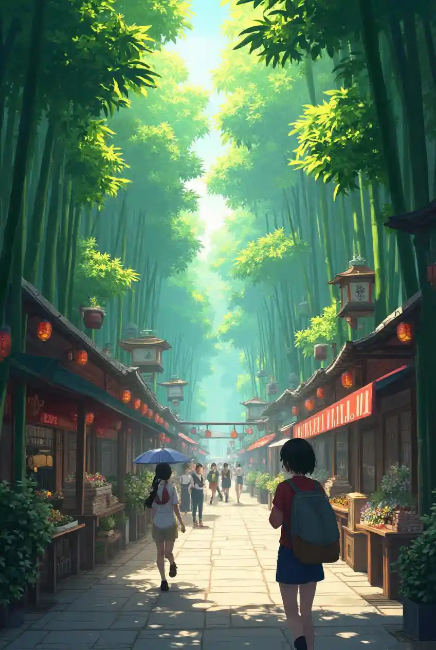 TinaVibrant marketplace in the heart of a bamboo forest, influenced by traditional anime aesthetics.