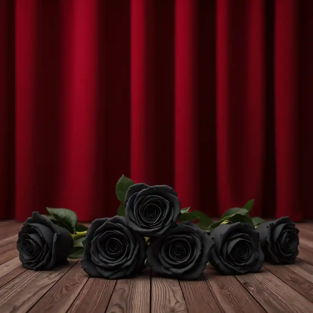 Kinsleysorte roser på et scenegulv med lukkede røde gardiner