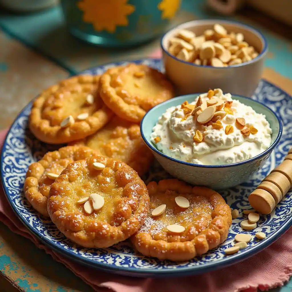 Skab et levende og tiltalende billede af en unik morgenmad spredt fra Mellemøsten og Afrika. Det skal være msemen med honning, sprødt koeksister, en skål græsk yoghurt med nødder og et stykke basbousa med mandler. Farverne skal være lyse og indbydende, og baggrunden skal afspejle regionens kulturelle væsen