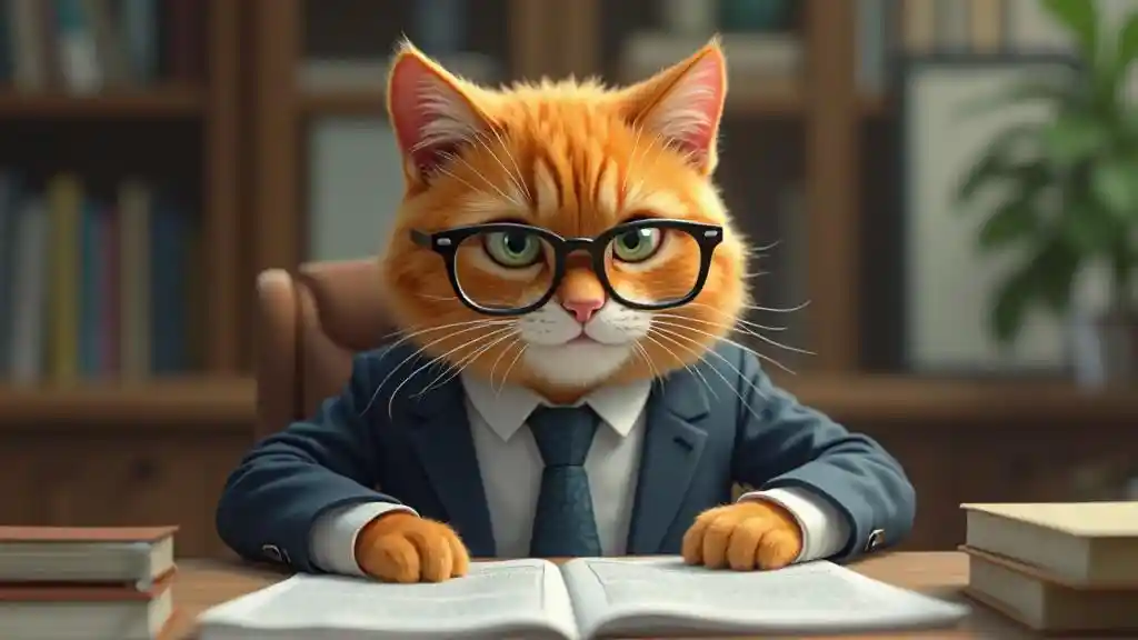 graceKat, orange, med jakkesæt og slips, læsebånd , sidder ved et skrivebord gennemgå dokument
