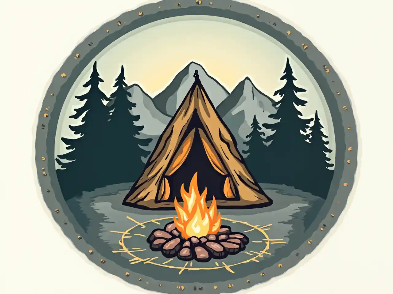 Et cirkulært logo med et telt, en lejrild, træer og bjerge bag et kompas, i illustrativ stil.