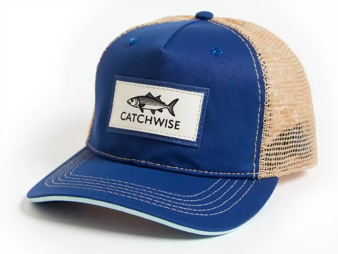 PaisleyEn blå og brun lastbilshætte med et fiskemærke og ordet "CATCHWISE".