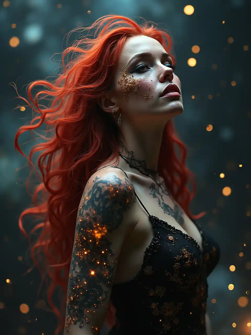 En betagende kvinde med alabaster hud og flydende guld årer flyder i nul tyngdekraft, hendes lange skarpsfarvede hår forvandler sig til strenge afsmeltede konstellationer. Hendes tårer er små sorte huller, der fordamper, når de falder. Hyperdetaljeret kosmisk gotisk stil, lysende tåge, indviklede filigrane tatoveringer, der lyser som supernovaer.