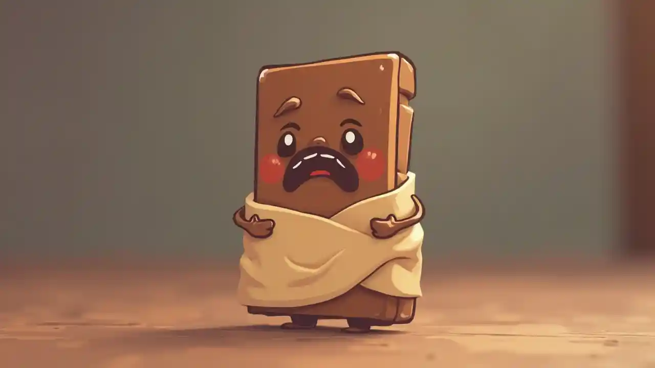 Animeret chokoladebar, der er halvt pakket med et trist, men sødt ansigt i børnestil animeret stil