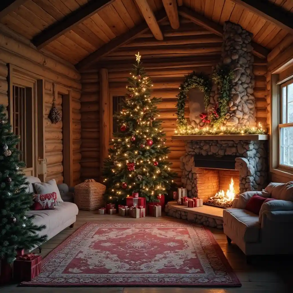 et hyggeligt værelse med trægulv, type hytte, med en pejs på den ene side og en juletræ på den anden, julegaver i baggrunden