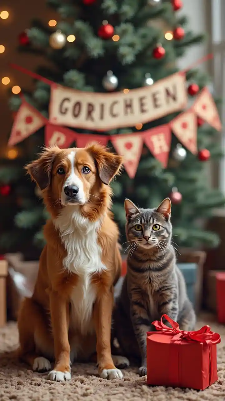 En brun collie og en kat fejrer jul bag et banner der siger "Gorchen"