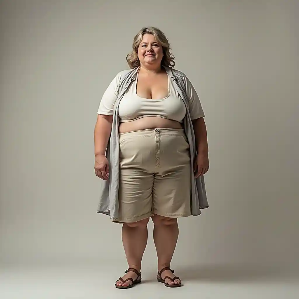 OwenOvervægtig og meget tyk, 40 år gammel, hvid, fed kvinde i to stykker tøj, der står i flade sandaler, der ryger en cigaret