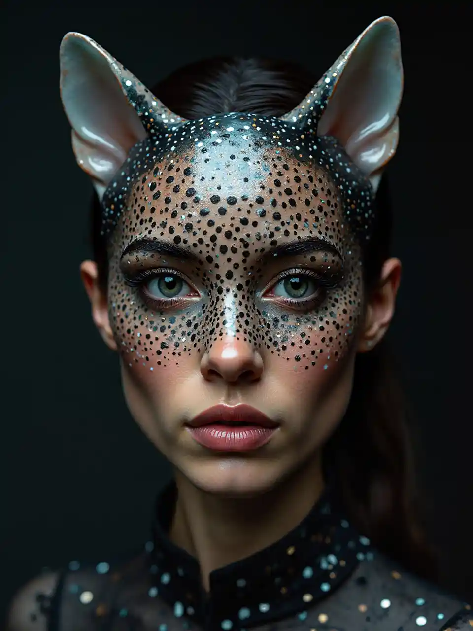 Forreste portrætfotografering, gennemsigtigt mørkt plexiglas trykt med prik farver katten kvinde maske, en attraktiv, 80 graders udsigt, kunst af Sergio Lopez, Natalie Shaw, James Jean og Salvador Dali