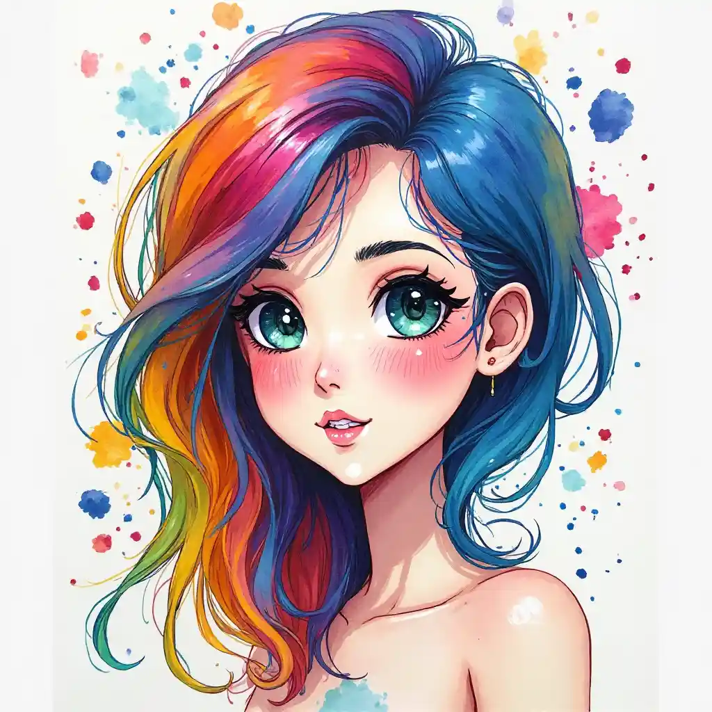 Vandmaling, tegning af en pige med farverigt hår og øjne, blæk, Artgerm, Stanley Artgerm Lau, airbrush maleri, blæk