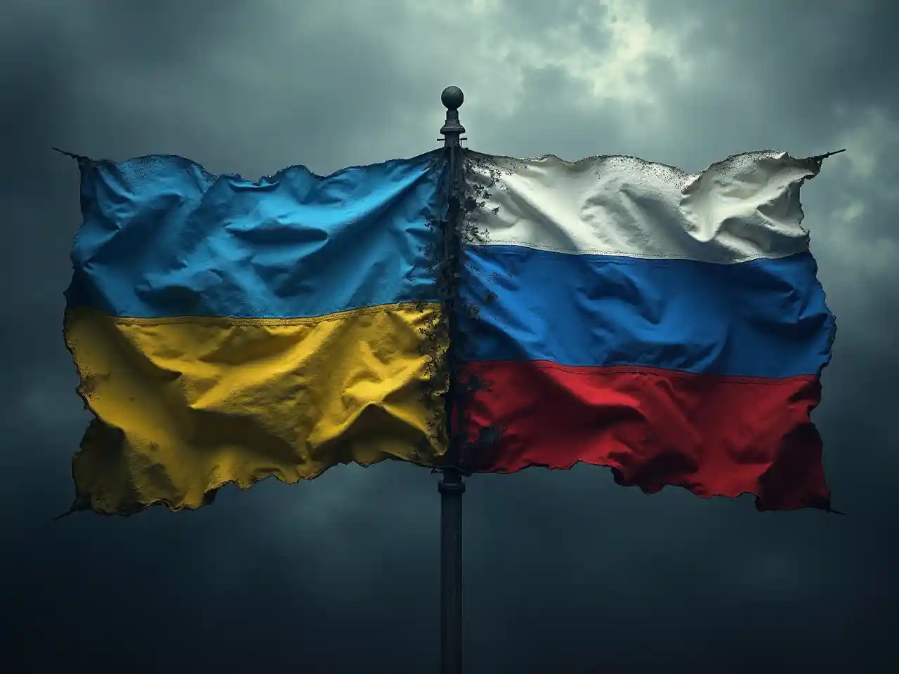 Et dramatisk digitalt billede med mørke toner viser det fulde ukrainske flag til venstre og det fulde russiske flag til højre, uden stangen. Flaggene ser skrumpede, revet og udtørrede ud som om de var resultatet af en konflikt. I midten ser der ud til at være revner eller en falmende effekt. Vignet-effekten er mørk og uklar, hvilket giver en følelse af pres, konflikt og sorg. Der er ingen brand eller eksplosion, men det er stadig følelsesmæssigt og meningsfuldt.
