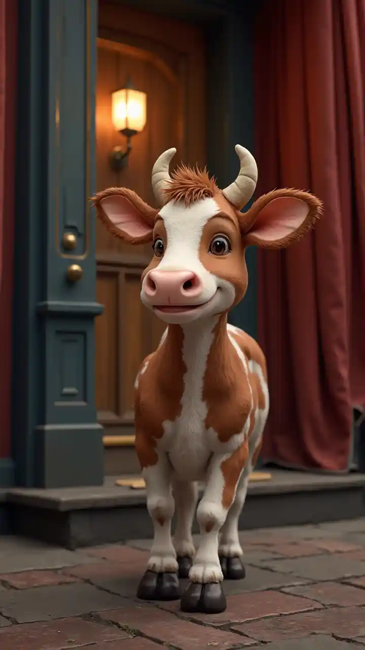 Sød lille jersey ko vifter til mig og smiler hilser mig foran teatert