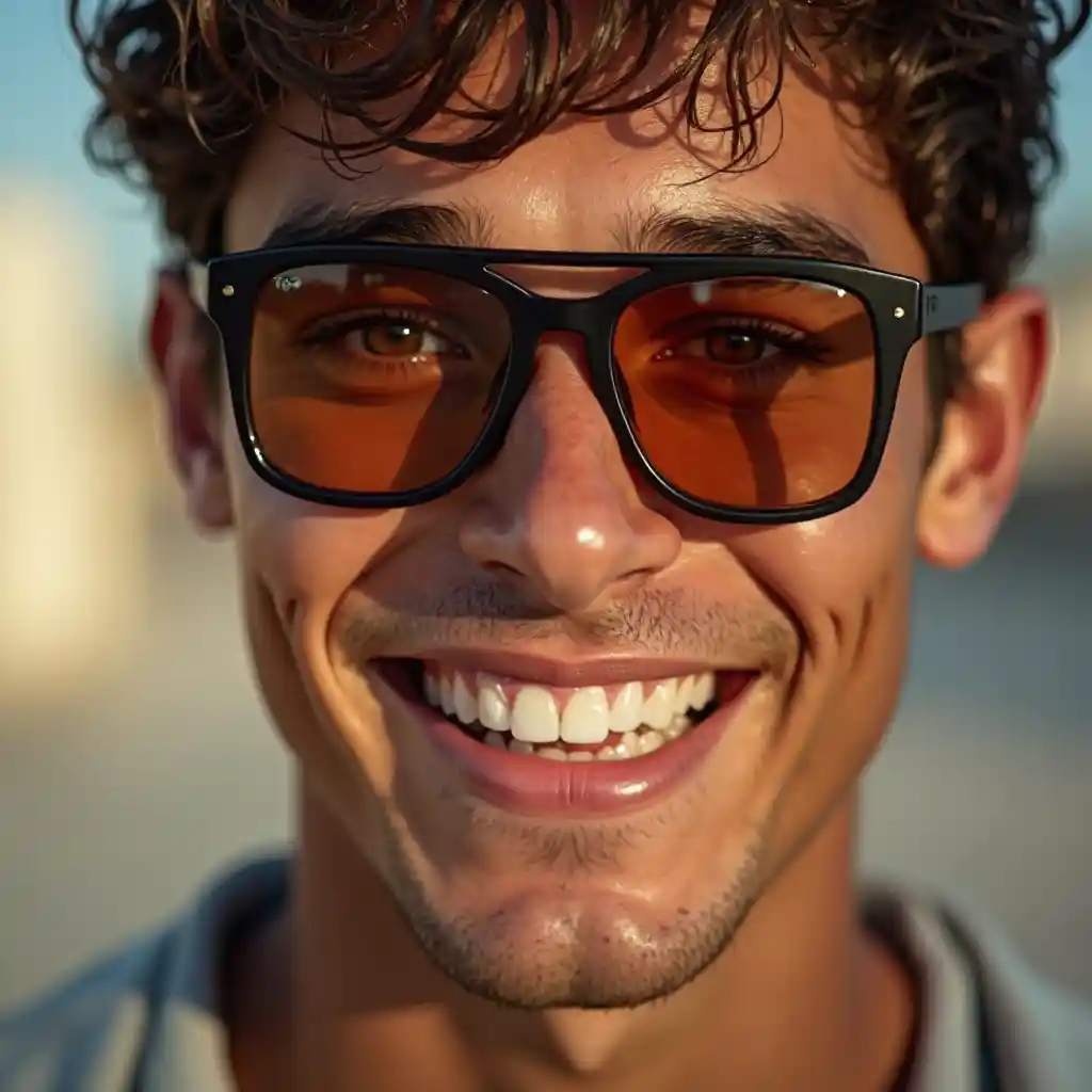 et meget klart og detaljeret billede af et smukt ansigt af en ung mand med glitrende hvide tænder, glat lys hud og skarpe fokus øjne med solrige orange farver, der viser levende kreativitet med et legende men sofistikeret udtryk. Motivet har på mørkt (solbriller)), der fremhæver den moderne æstetik. Billedet er sat mod en (mildt sløret) baggrund, hvilket skaber et perfekt 8K, UHD visuelt, der udstråler banebrydende teknologi og opmærksomhed på detaljer.