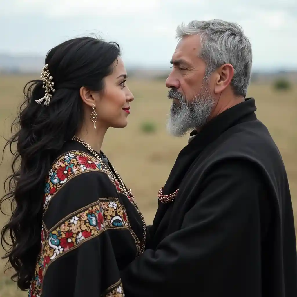 En kvinde med sort hår i traditionel mexicansk påklædning kigger på en gråhåret mand med et gråskæg iført alle sorte tøj kigger på hinanden fra en afstand i et åb felt