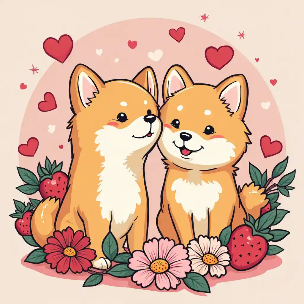 Et sødt stiliseret banner illustration, tyk kontur, tyk linjer, flad farve, levende farver, lyse farver, farverigt tema, glitter, dynamisk vinkel, dynamisk pose, Flatline, Flat vector illustration, hjerter, love_hearts, blomster, shiba inu hvalpe, jordbær, daiseys
