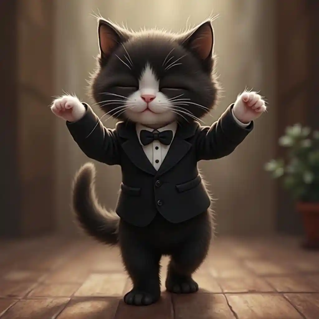 en sort killing med en hvid pande i formelt tøj, der danser til blød musik, han er sød