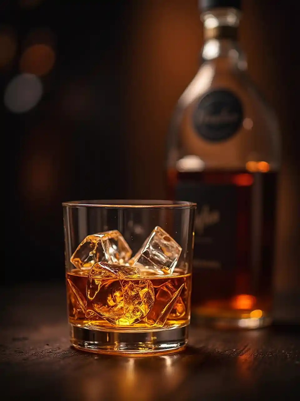 flaske whisky med isstykker, mørk atmosfære, professionelt billede, ravlys