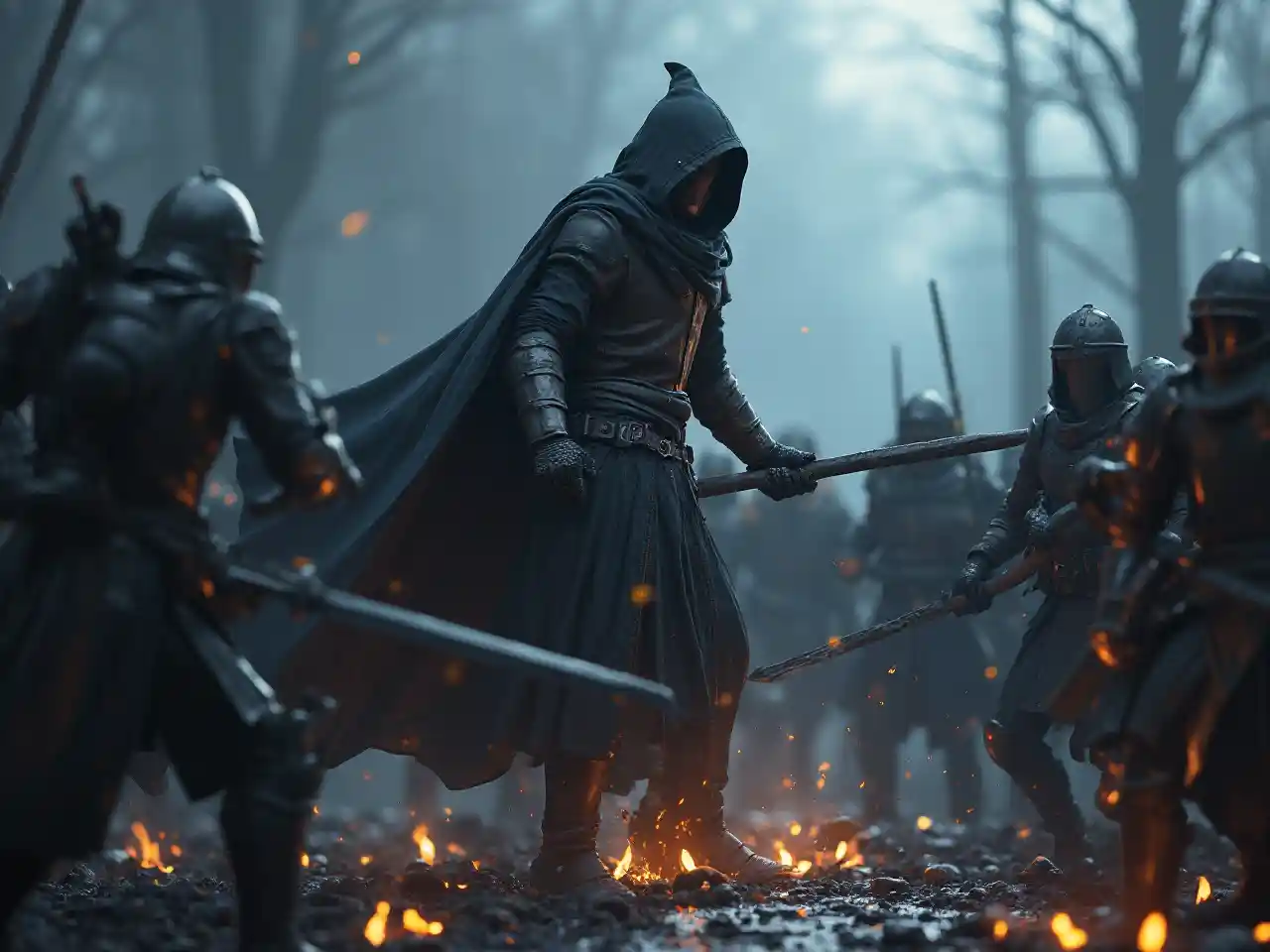 Mørkhuddet troldmand kæmper hær af riddere et mesterværk, 8k opløsning, mørk fantasi koncept kunst, af Greg Rutkowski, dynamisk belysning, hyperdetaljeret, indviklet detaljeret, Splash screen art, trend på Artstation, dybe farver, Unreal Engine, volumetrisk belysning, Alphonse Mucha, Jordan Grimmer, mørke kraver