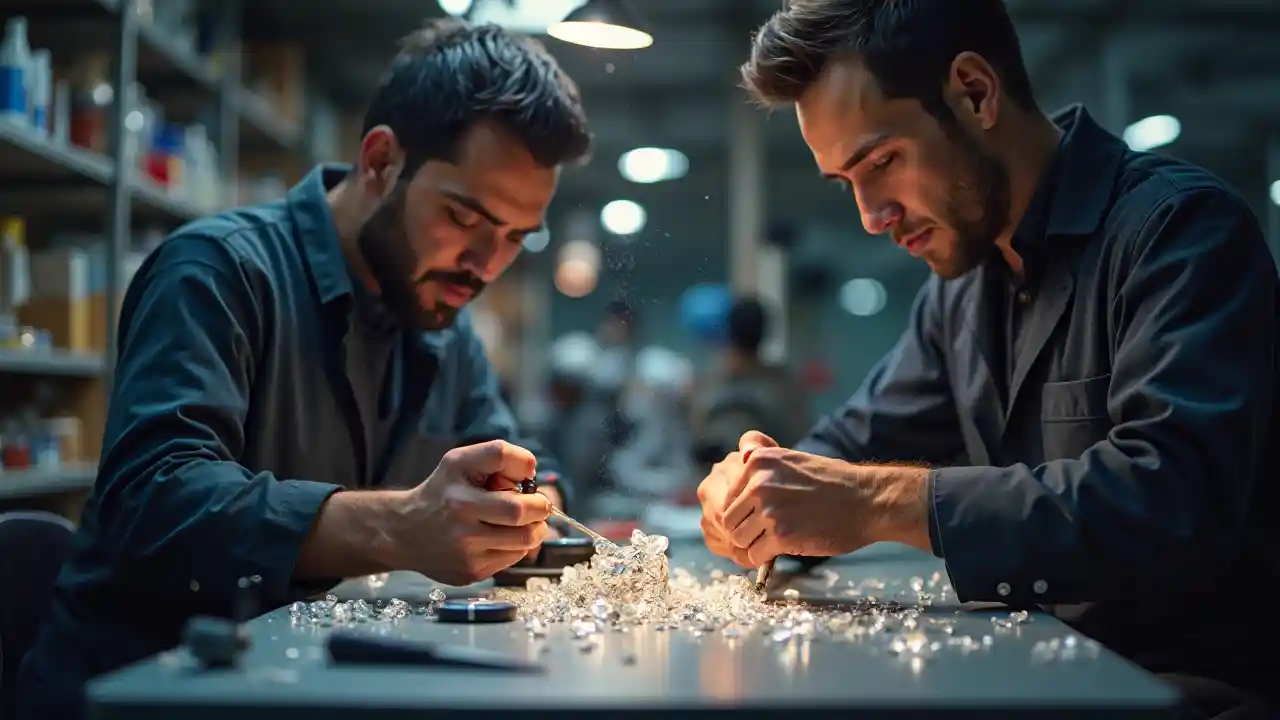 Diamantpolering og -skæring, arbejdere, der omhyggeligt former og forbedrer diamanter, glimrende refleksioner, lyse overlys, detaljeret håndværk, varm stemning, fokuserede udtryk, materialer af høj kvalitet, ultra detaljerede facetter, spredt værktøj, ædelstens støv i luften, kunstnerisk præsentation, produktiv atmosfære, fotoreal, 4K opløsning, ren og moderne arbejdsplads